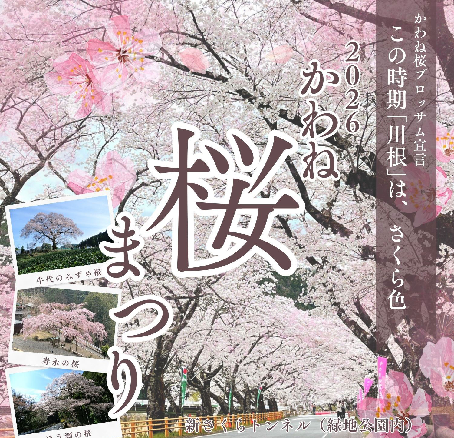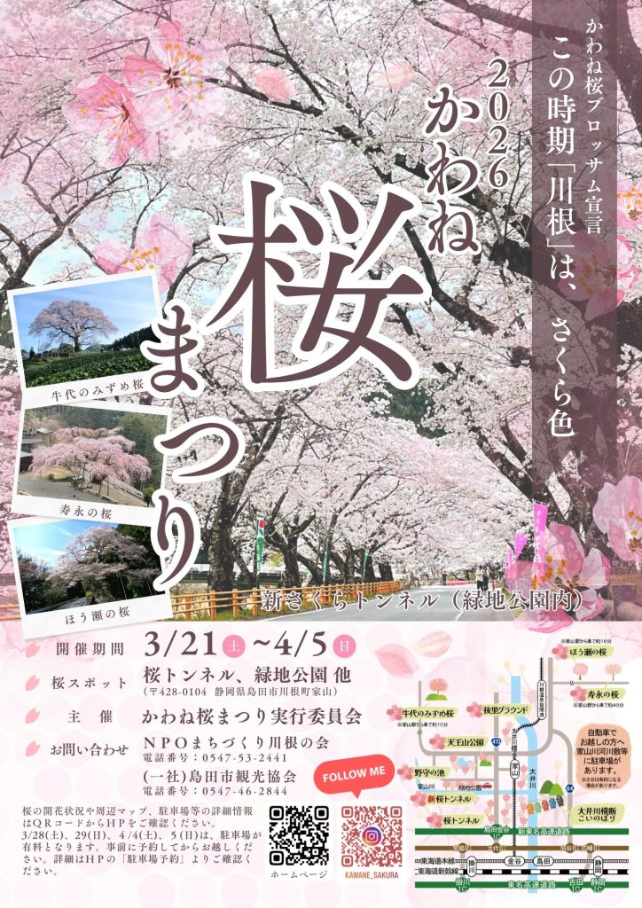 2026年かわね桜まつり開催のお知らせ 下記のとおり、2026年かわね桜まつりの開催決定をお知らせいたします。桜の開花状況やイベント情報等、随時ホームページでお知らせいたします。 開催期間3月21日(土)~4月5日(日)桜スポット桜スポットはこちらをご覧ください